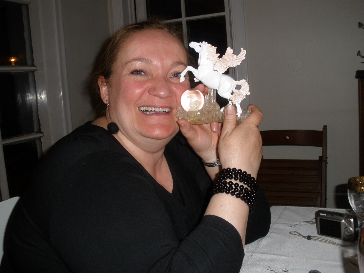 Um síðustu helgi var árshátíð hins virta leshrings, ringo.15 sem er „blandaður leshringur karla og kvenna“ sem hefur starfað síðan á 10. áratug síðustu aldar. Þemað var franskt: bók kvöldsins var Hlutirnir eftir Georges Perec; svo var  lax í hvítvínslegi, dýrindis lauksúpa, eplasorbet, grænt salat, ostar, beinlausir fuglar og súkkulaði-mousse. Og eðalvín með hverjum rétti. Veisla ársins!  Hér sést Hulda handleika Pegasus, hinn vængjaða skáldfák Medúsu.