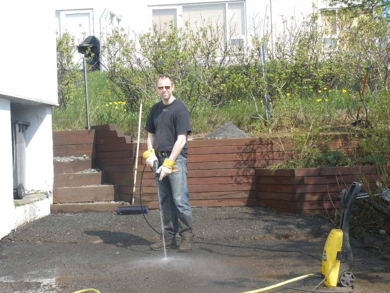 Einstök veðurblíða í dag, hvítasunnudag. Það var kominn tími á viðhald og garðvinnu. Ég reytti arfa og stakk upp hvönn og fífla, Brynjar smúlaði planið og svalirnar, skóf mosa og fíflabeð. Inga og Arwen skottuðust í kring.Undir kvöld vorum við bæði sólbrennd, rifin og rispuð, með brotnar neglur, bakveik og lemstruð en alsæl með árangurinn.