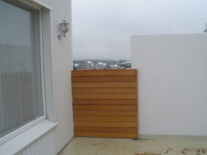 Þá er smíði skjólveggsins mikla lokið (reyndar á eftir að setja stál-/álhatt ofan á, bæði upp á lúkkið og til að styrkja böndin). Síðasta spýtan skrúfuð í undir kvöld, smiðshöggið hefur verið rekið. Nú vantar ekkert – nema góða veðrið.
