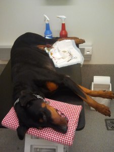 Arwen var rosa spræk í morgun og stökk útí næsta limgerði í gleði sinni. Því miður var nýbúið að höggva greinar af trjánum svo hún skar sig hressilega á lærinu. Gleðilætin breyttust því snarlega í sárt ýlfur. Þetta var svöðusár og því var farið með hana til dýralæknis. Þar var hún deyfð og svæfð og saumuð 10 spor. Nú er hún slöpp og sloj og vill ekki einu sinni matinn sinn. Svo fær hún kraga um hálsinn um leið og hún hressist, það eru ekki góðir dagar (né nætur) framundan. En dýralæknirinn dýri er örugglega ánægður.