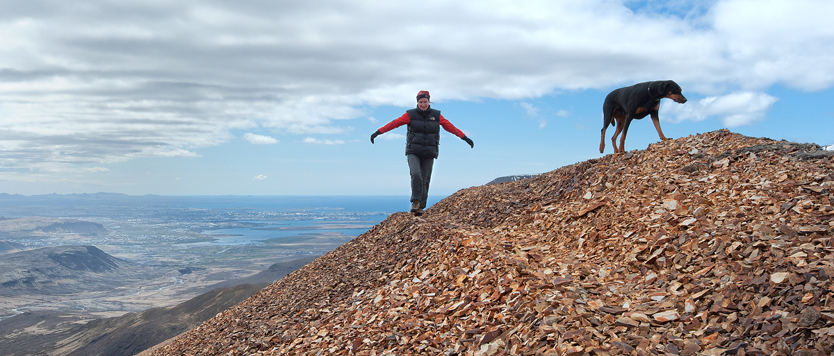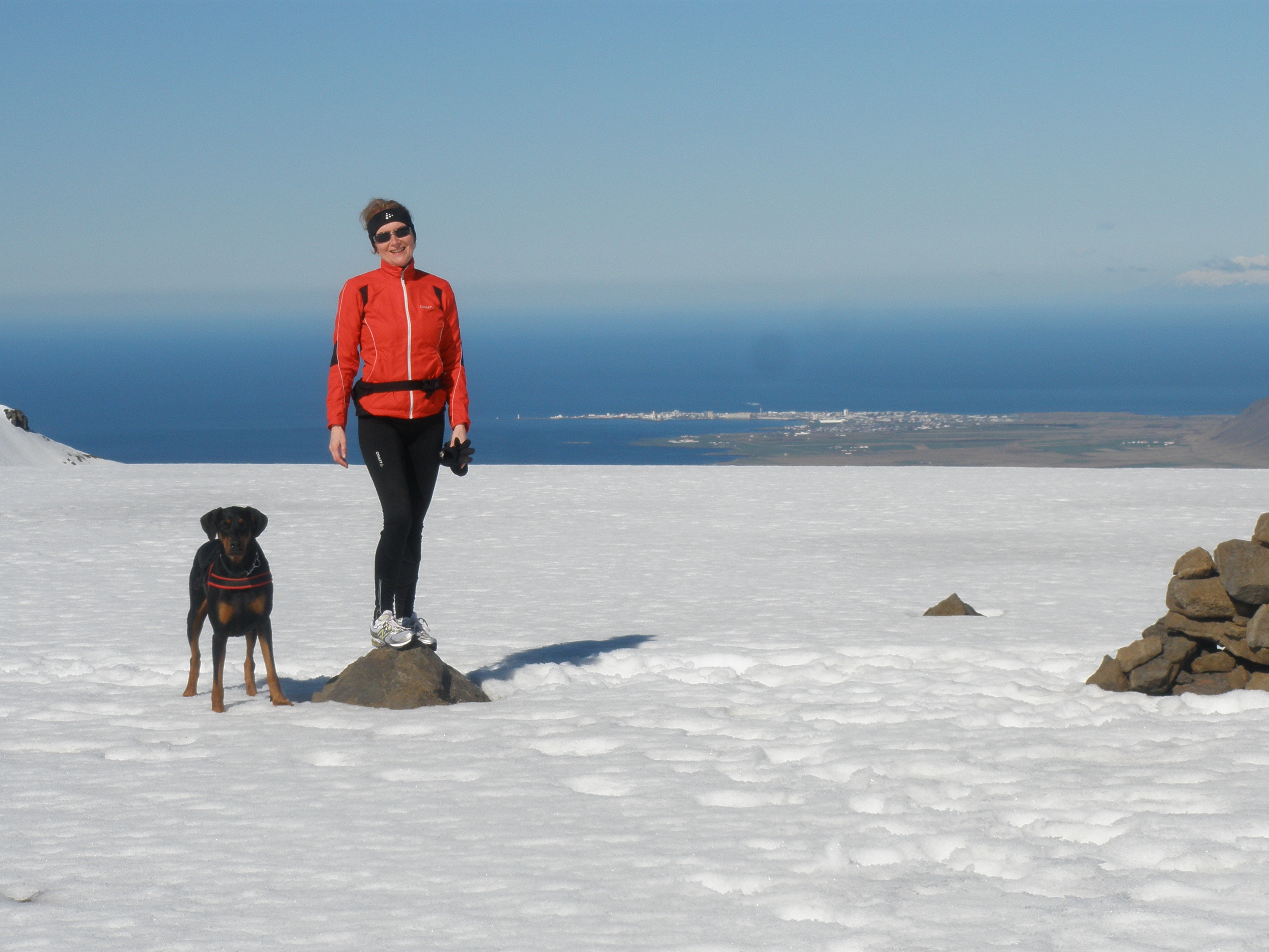 Gönguferð með Arwen er alltaf ljúf. Þessi mynd var tekin um daginn í kvöldvorsólinni í Garðabæjarhrauni. Frúin er í nýrri flíspeysu. Hlaupatúr er líka vel þeginn hjá Arwen, ekki síst ef hún fær að vera laus og getur skottast í kringum okkur. Hún var lúin í gær eftir 7,5 km í kringum Helgafell á góðum spretti.
