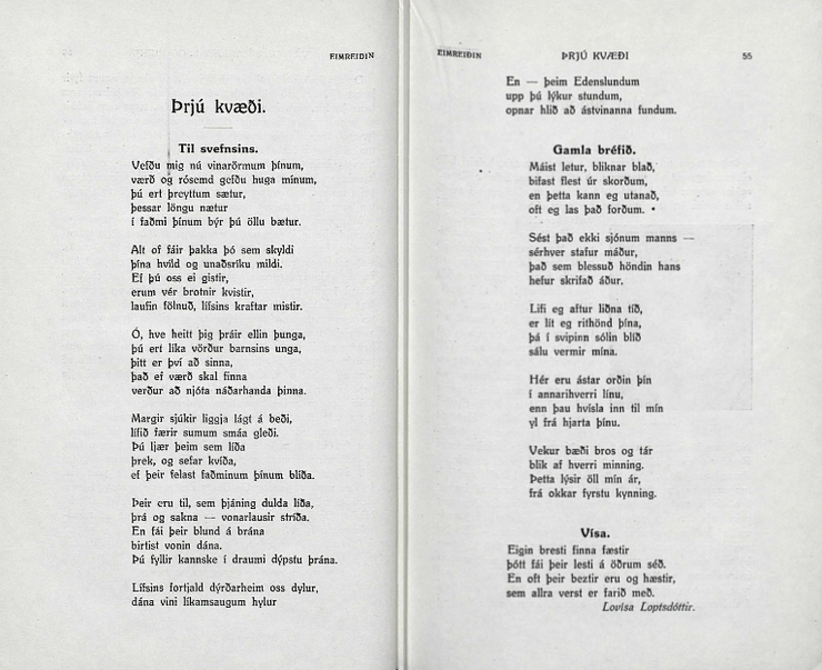 Í Eimreiðinni 1925 birtust nokkur kvæði eftir skáldkonuna á Sandlæk undir nafninu Lovísa Loptsdóttir og Halla Loptsdóttir:
